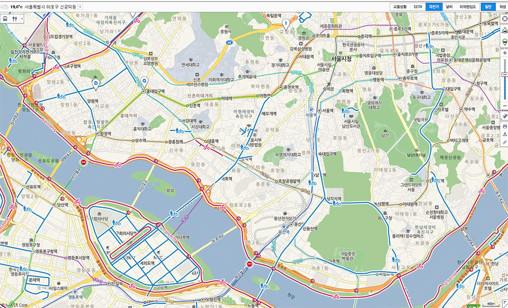 다음 자전거 지도는 Pc 다음 지도의 우측 상단 ‘자전거’ 버튼을 선택하거나 다음 지도 모바일 앱의 지도 설정 메뉴에서 자전거 지도를 선택하면 볼 수 있다.